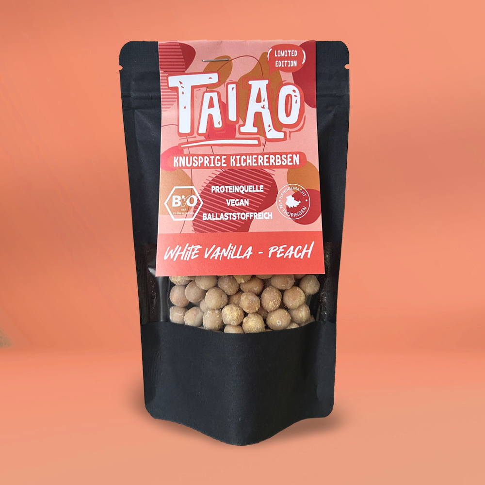 Zutaten: 47,83% Geröstete Bio-Kichererbsen*, 47,83% Bio-Weiße-Kuvertüre*(Kakaobutter*38%, Roh-Rohrzucker*, Reissiruppulver* Erdmandelmehl*, Salz), Salz, Pfirsichpulver